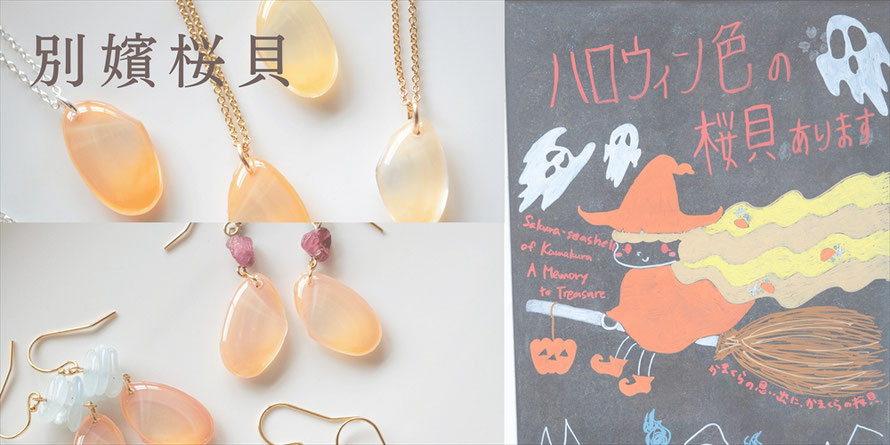 この季節は「ハロウィンカラー」と称し、店頭では橙色の桜貝アクセサリーを豊富にご用意しています。